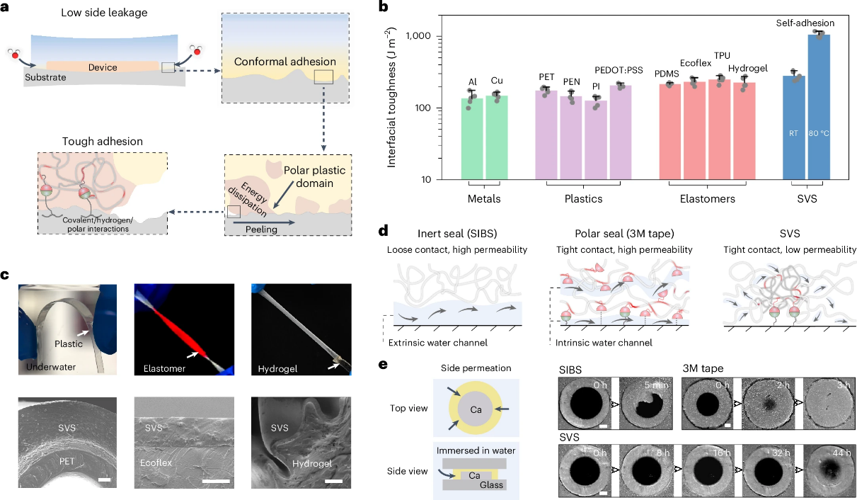 The viscoplastic surface enables SVS to form conformal, tough, and stretchable adhesions with metals, plastics, and elastomers, covering common electrode, dielectric, and substrate materials used in stretchable electronics. These intimate contacts, combined with the intrinsically low WVTR, allow SVS to effectively mitigate the side leakage. The optical calcium corrosion test revealed that the SVS-sealed sample survived for more than 32 hours, over 15 times and 300 times longer than that of the tape-sealed and SIBS-sealed samples when immersing these sealed calcium disks in water at room temperature.