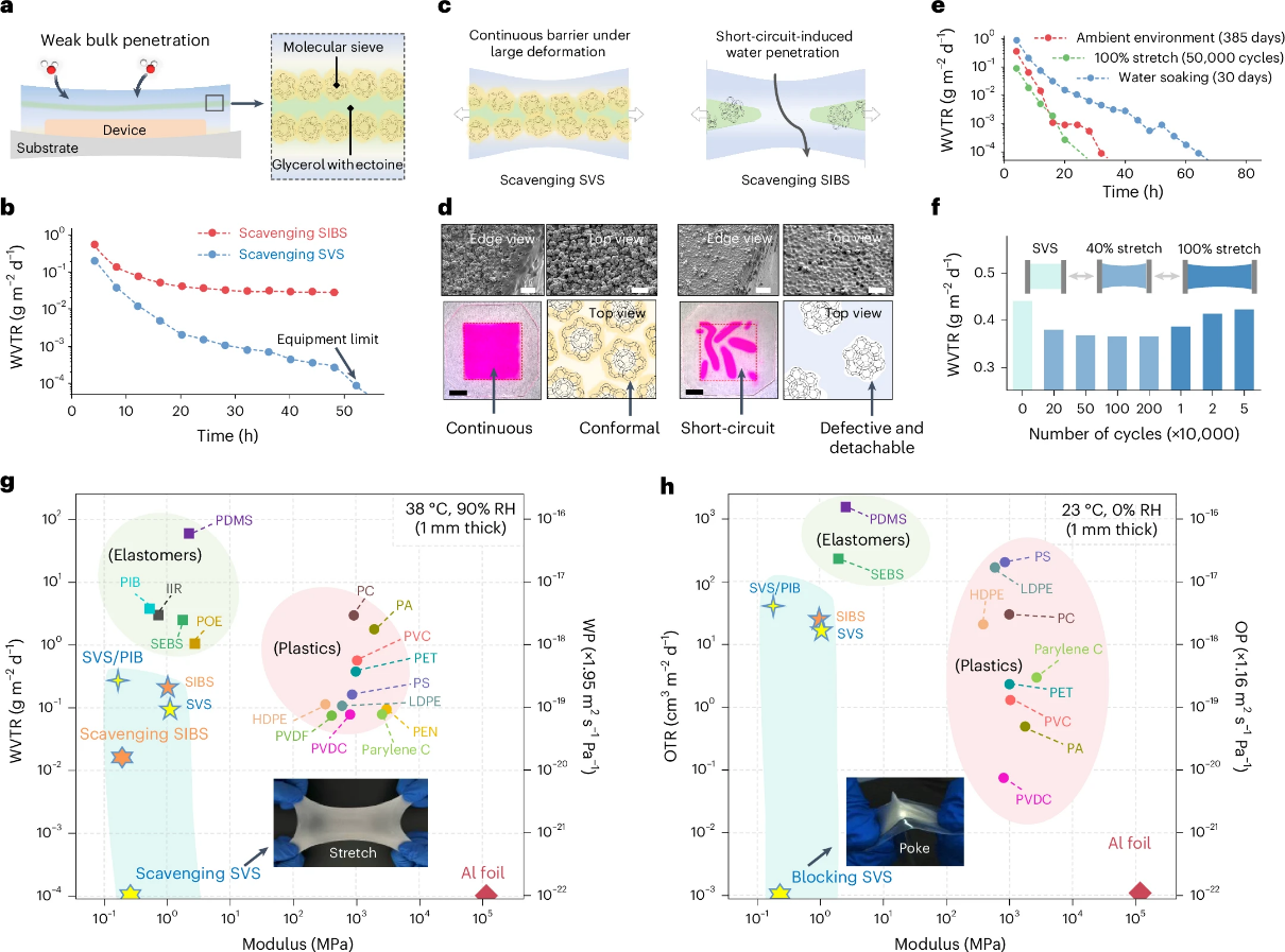 To address the challenge of bulk penetration, the researchers developed a highly stretchable and impermeable composite by exploiting the ease-of-integration feature of SVS endowed by its surface viscoplasticity to assemble water scavengers. This composite includes an embedded solid layer composed of molecular-sieve particles and a high-viscosity liquid layer composed of glycerol and Ectoine. The steady-state WVTR of Scavenging SVS film was below the detection limit of our equipment (9×10-5 g·m-2·day-1), the lowest value among the reported work. Furthermore, the Scavenging SVS showed no WVTR increase after 385 days in ambient air, 30 days underwater, or 50,000 cycles at 100% strain, demonstrating robust longevity.