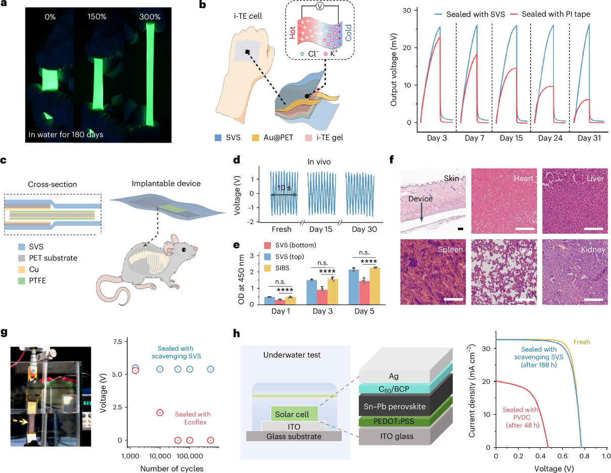 In addition, SVS protection extended the working lifetime of an ionic thermoelectric (i-TE) cell made from hydrogel to over 30 days, approximately one order of magnitude longer than that of a polyimide-protected i-TE cell. In vivo, SVS consistently maintained the electrical output of a stretchable electromechanical device for 30 days, confirming its excellent biocompatibility and hermetic performance. Similarly, a tin-lead (Sn-Pb) perovskite solar cell top-sealed with Scavenging SVS retained a stable power conversion efficiency of around 18.4% after 188 hours of water immersion, surpassing the performance of commonly used polyvinylidene chloride (PVDC).