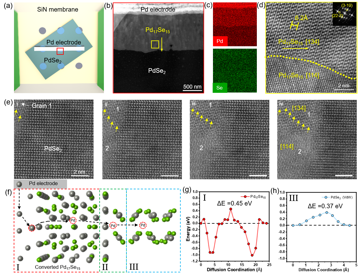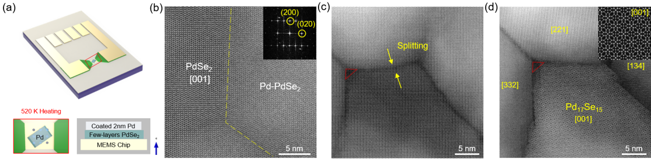 Building on this discovery, the team further applied the phase transition mechanism to device fabrication. By depositing ~30 nm thick Pd electrodes onto the PdSe2 surface, in-situ STEM observations revealed that Pd17Se15 grains grew laterally by gradually consuming the underlying PdSe2. This strategy offers a novel approach for constructing high-quality 2D metal–semiconductor contacts under mild thermal conditions.