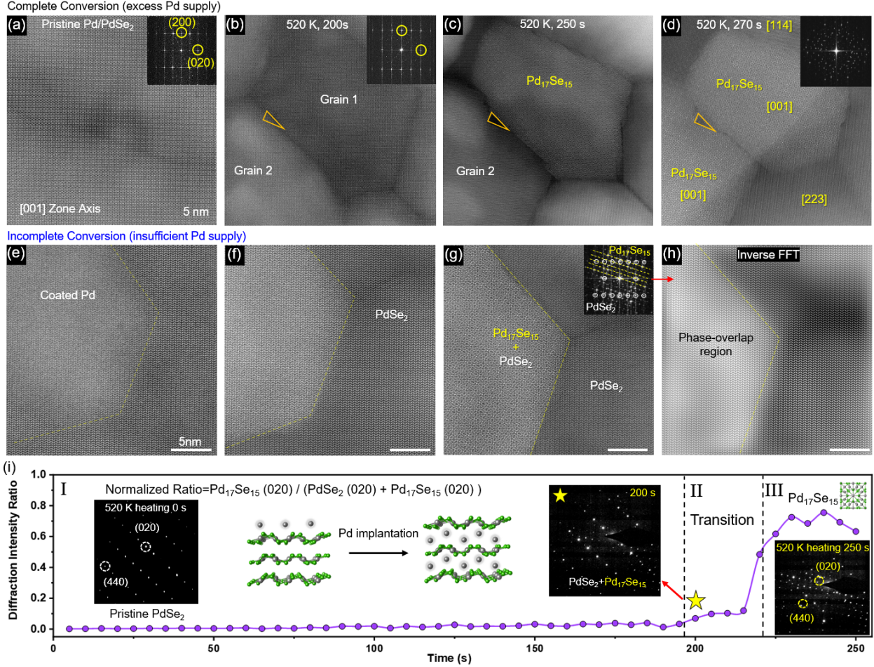 Tracking of electron diffraction intensities further revealed the dynamics of a threshold-triggered process: the diffraction peaks of PdSe2 remained stable for an extended period before rapidly diminishing at a critical moment, while the characteristic peaks of Pd17Se15 surged abruptly. This behavior exhibits a classic three-stage kinetic process—latent accumulation, threshold-triggered collapse, and grain integration.