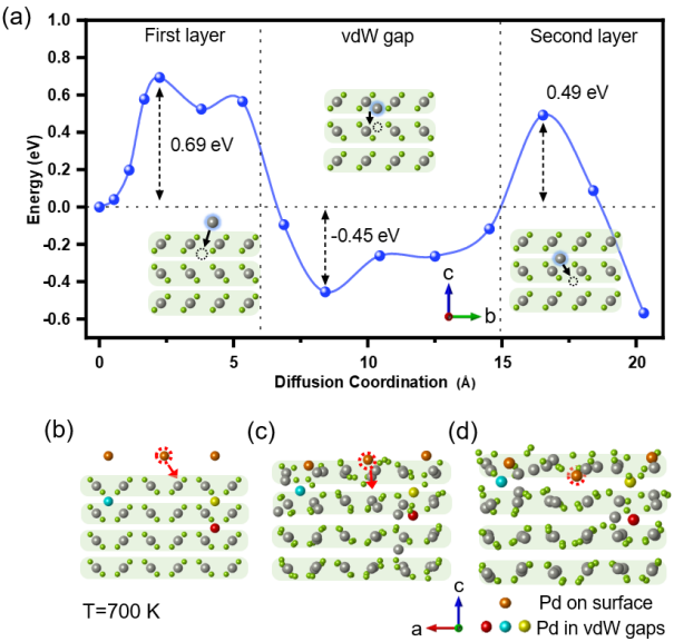 Using first-principles calculations and ab initio molecular dynamics simulations, the team further uncovered the microscopic mechanism underlying the latent phase transition. The results show that the diffusion barrier for Pd atoms entering the interlayer space of PdSe2 from the surface is approximately 0.69 eV, and an energy well of about –0.45 eV exists within the vdW gap, which facilitates Pd trapping and sustained interlayer accumulation. The energy barrier for further vertical diffusion into deeper layers is around 0.49 eV, indicating considerable vertical migration capability within the system.