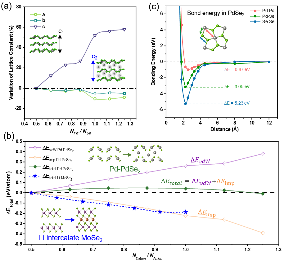 In the early stages, the system’s energy increases, indicating that PdSe₂ resists intercalation. However, once the Pd concentration exceeds a critical threshold, ΔEimp becomes dominant, causing a sharp drop in energy and triggering a structural transformation. In contrast to conventional ion intercalation processes—such as Li insertion in MoSe₂—that show a monotonic energy decrease and a continuous phase transition, the phase transition in PdSe₂ exhibits pronounced “delay” and “threshold-triggered” characteristics.