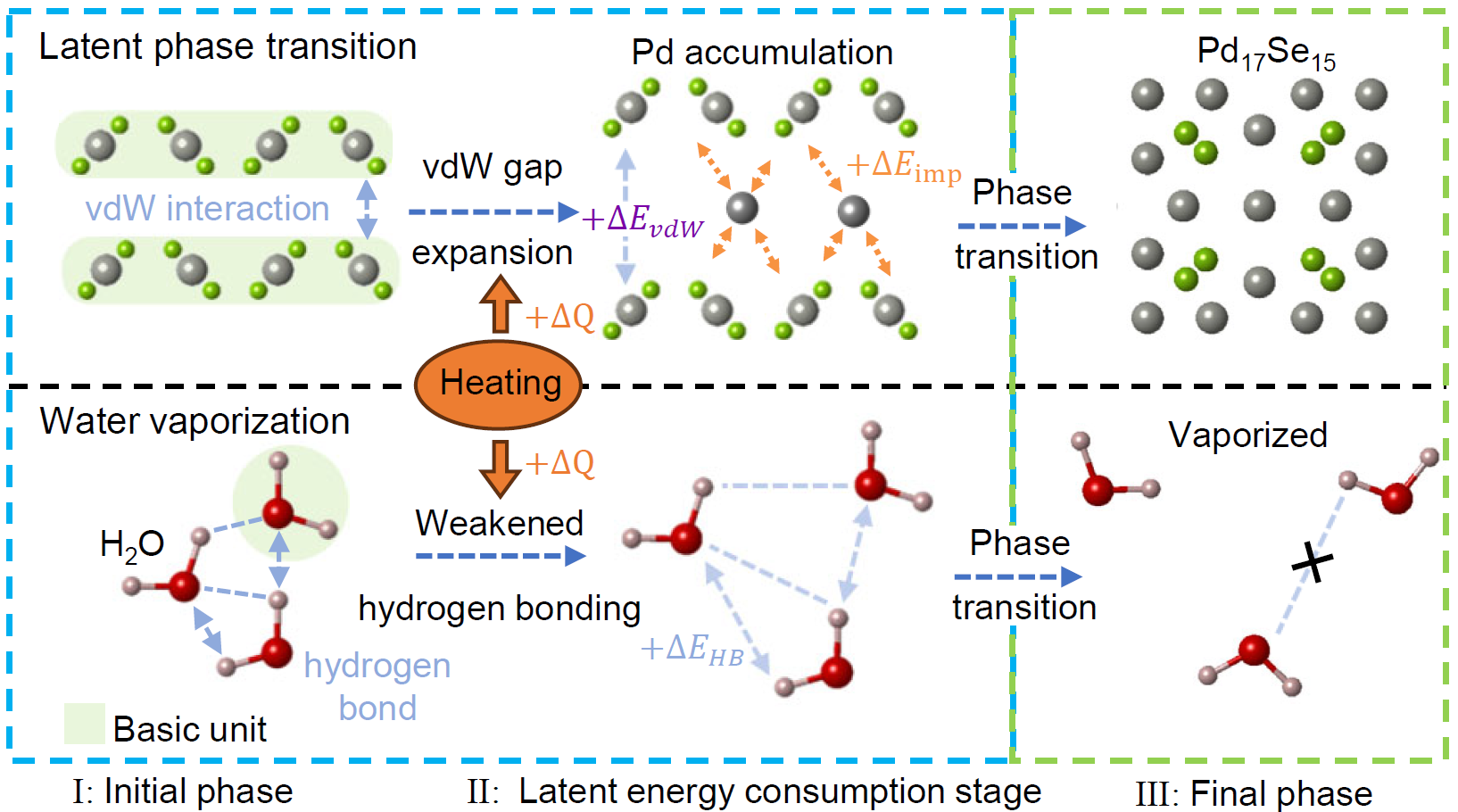 This mechanism resembles the process of latent heat absorption during water vaporization: the absorbed heat weakens hydrogen bonding while the overall temperature remains constant. In the initial stage of the PdSe2 phase transition, the 2D atomic layer structure remains intact, and the thermal energy absorbed by the system is used to weaken the interlayer vdW interactions. Once the Pd concentration surpasses a critical threshold, the 2D PdSe2 framework abruptly collapses into the 3D Pd17Se15 phase—closely analogous to water undergoing vaporization. This discovery not only unveils an unprecedented mode of structural transformation in PdSe2 but also offers a new perspective for understanding solid-state phase transitions in 2D materials.