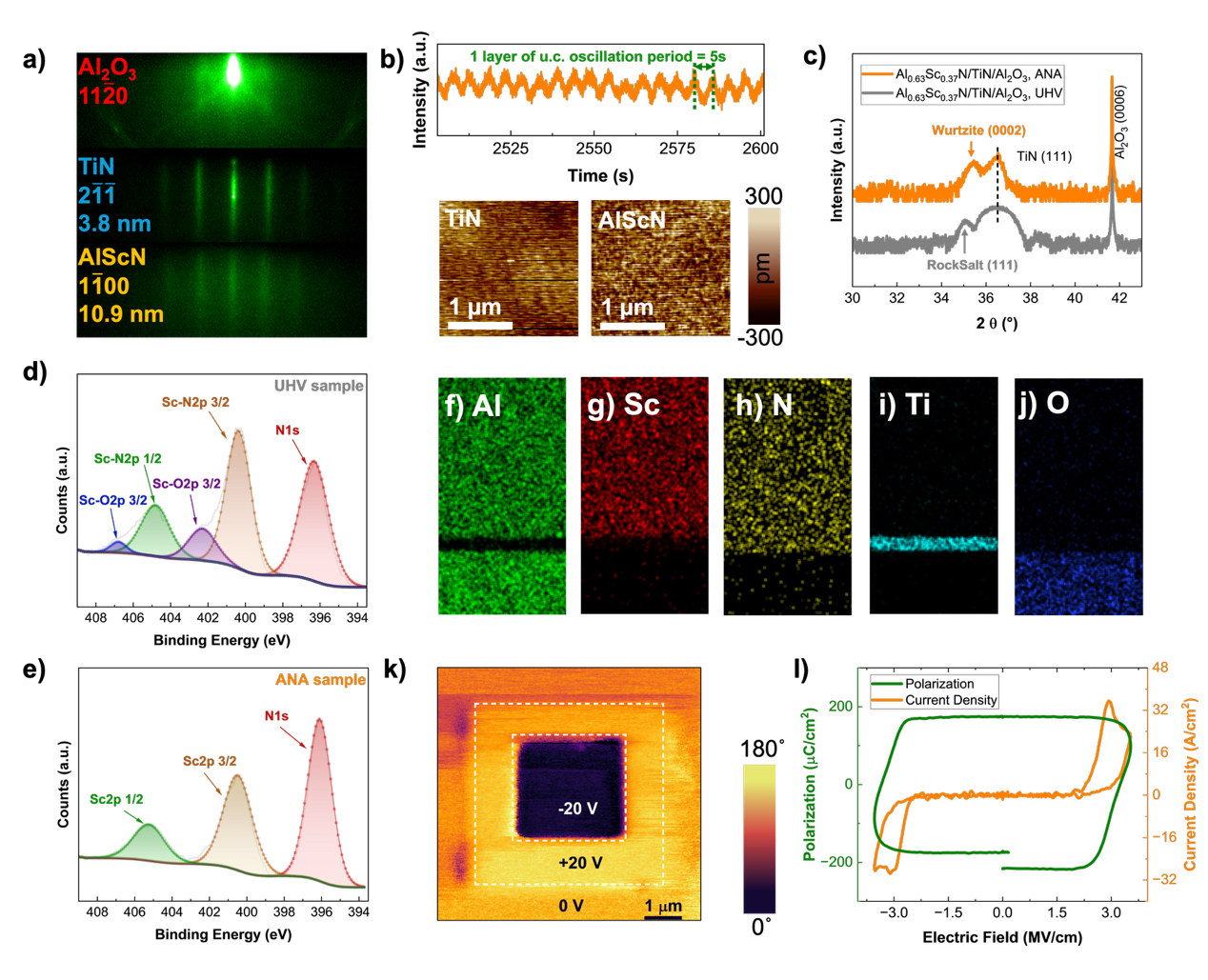 In N-PLD-grown films, Sc-O bond signals were eliminated (Figures 2d-e), and element distribution was uniform, with no Sc segregation or oxygen contamination (Figures 2f-j). PFM measurements showed 180° phase reversal (Figure 2k), while P-E testing indicated a remanent polarization of 160 μC cm-2 and a coercive field reduced to 2.9 MV cm-1 (Figure 2l).