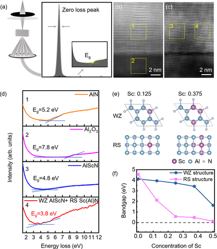 The team also discovered that growth temperature plays a key role in regulating leakage current in AlScN ferroelectric films. In high-temperature-grown AlScN samples, even with a Sc content of only 0.1, localized Sc segregation into the rock-salt phase occurs. Low-loss EELS analysis (Figure 3a) revealed that rock-salt phase nanoparticles reduce the bandgap (Figures 3b-f), potentially forming leakage pathways.